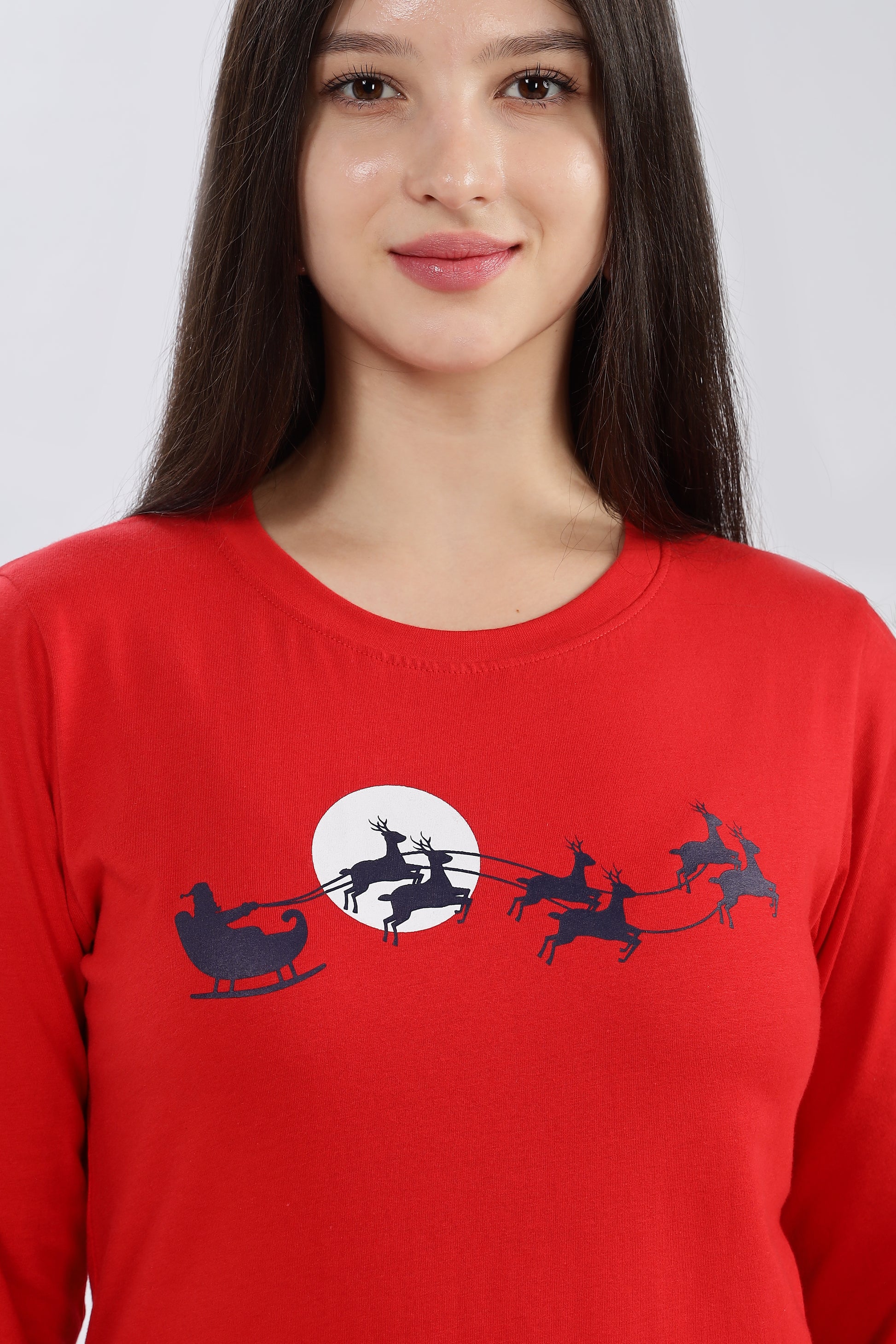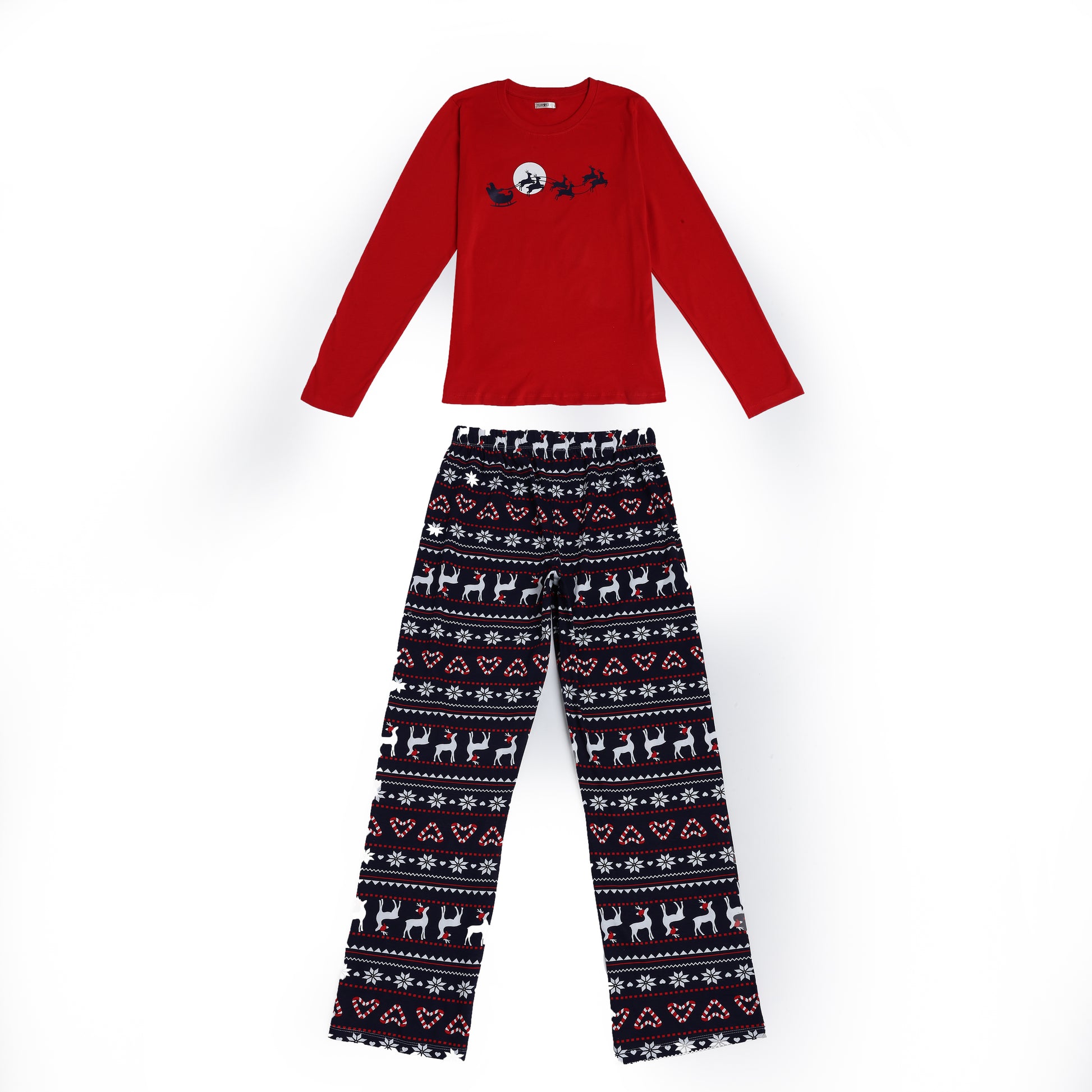 Festive Christmas design with a red long sleeve top featuring Santa sleigh graphic and navy trousers with reindeer fair-isle print