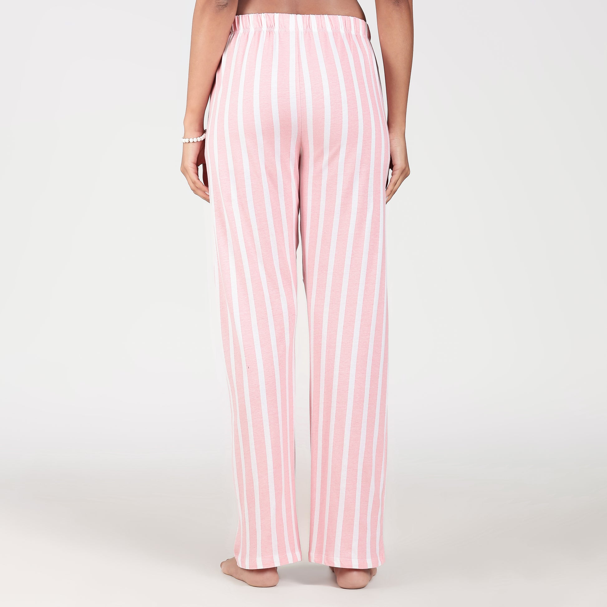 Classic Striped Bottoms: Bright white and peachy pink vertical stripe trousers with a soft elastic waistband for a relaxed fit.