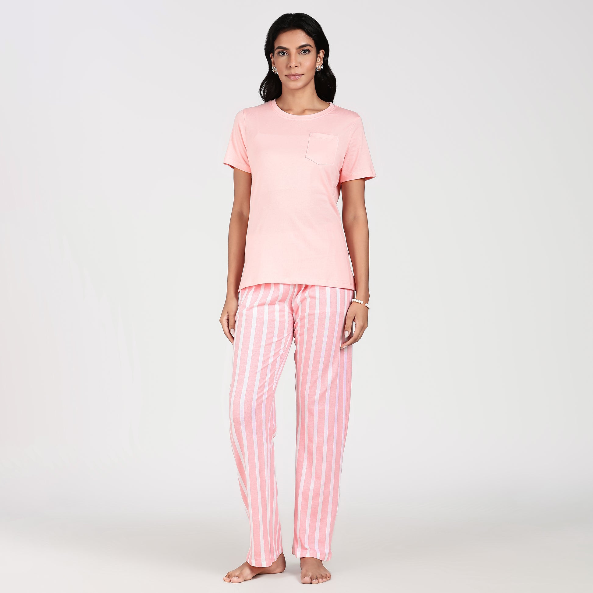 Upgrade your nightwear with the Turtle Women’s Peachy Pink Stripe PJ Set – designed for ultimate comfort and timeless style. The set features a soft cotton short-sleeve T-shirt in peachy pink with a practical chest pocket and contrast neck tape, paired with striped pajama bottoms in peach and white. Made from 100% breathable cotton jersey, this set ensures cool comfort through the night and easy lounging during the day.