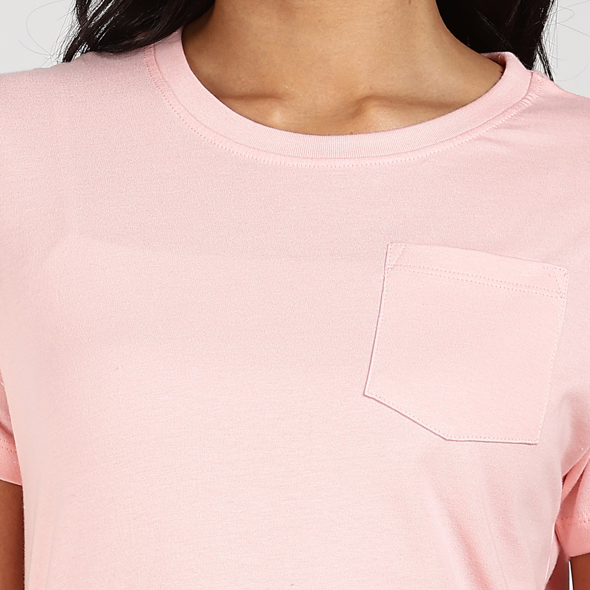 Stylish Design: Solid peachy pink short-sleeve T-shirt with contrast neck tape, chest pocket, and neat double-needle stitching.